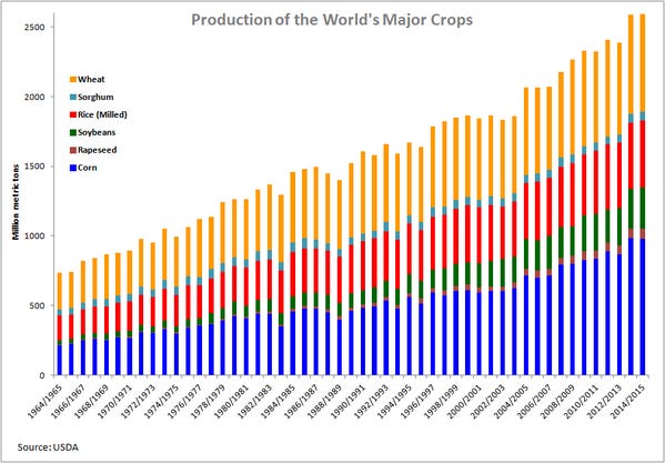 Norman Borlaug’s Green Revolution, sparked by plentiful and cheap energy in the form of oil, natural gas and coal, has resulted in exponential population growth. Production of the world’s major crops has increased by almost 5x in a 60 year period between 1965-2015:
