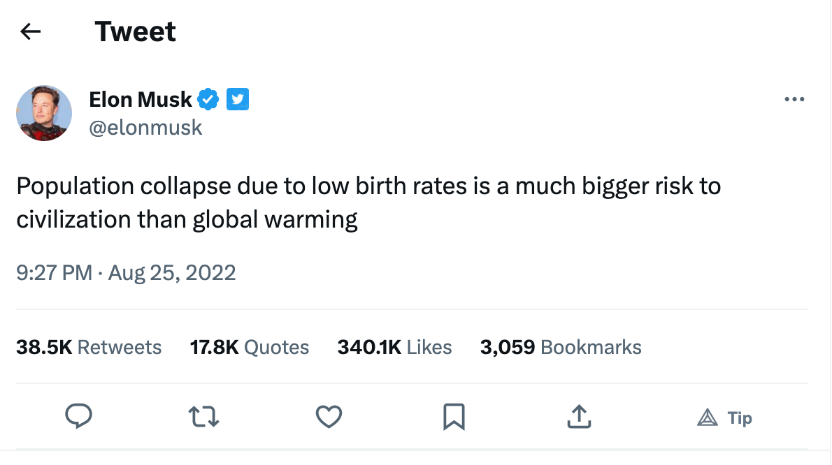 Elon Musk is concerned in the other direction; he wants unlimited population growth. His reasoning is that the world economy is rooted in a model of “forever growth” and social safety nets are based on blatant ponzi schemes that need ever-increasing populations to sustain them. Faltering population growth could result in an economic death spiral. Musk tweeted: