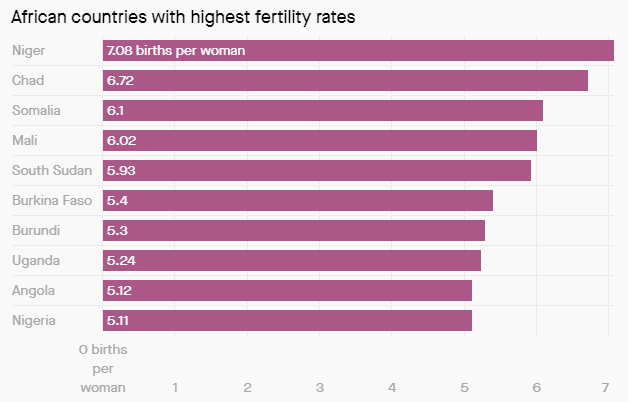 African countries with the highest current total fertility rates are as follows:
